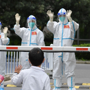 ↑4月30日,走出醫院準備回家時(shí),小華(前中)和姐姐、媽媽?zhuān)ㄓ乙唬┮黄鸹厣硐蜃o送他們出院的醫護人員揮手道別。當日,由上海交通大學(xué)醫學(xué)院附屬仁濟醫院南部院區(新冠定點(diǎn)醫院)收治的3歲重癥新冠患者小華(化名)出院。