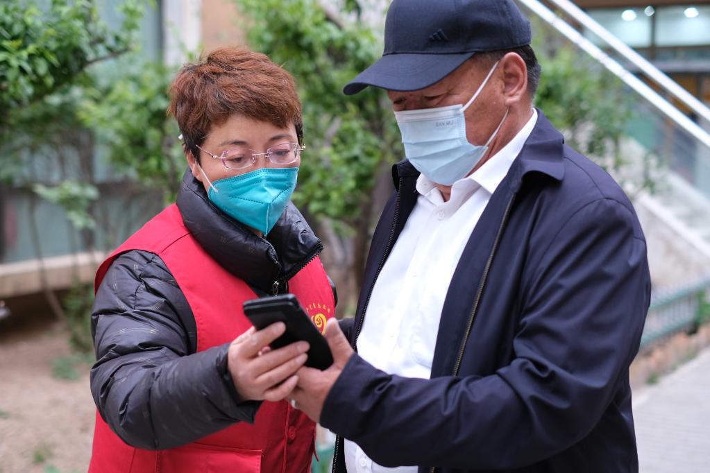 5月13日,張梅在西寧市城西區陽(yáng)光華府小區核酸檢測點(diǎn)查驗居民的健康碼和行程碼。(新華社記者 童昊 攝)