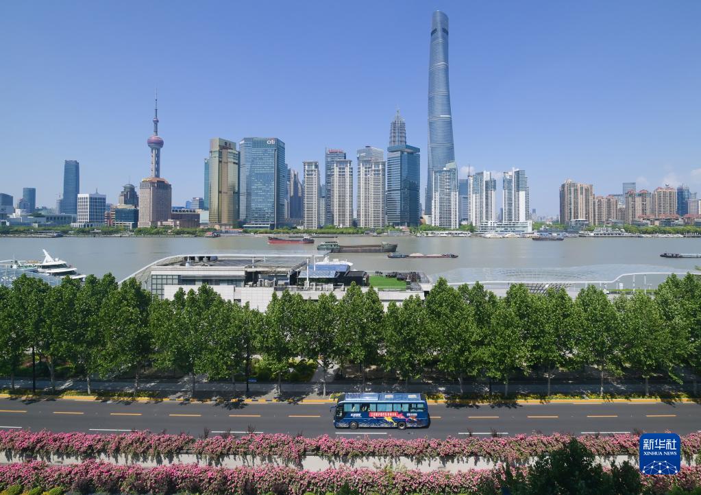 一輛載有援滬醫療隊員的大巴車(chē)駛過(guò)上海外灘(5月5日攝)。新華社記者 李賀 攝