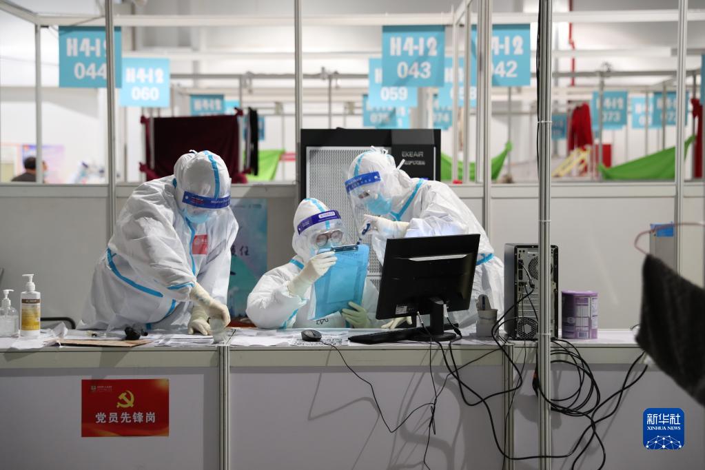 上海世博展覽中心方艙醫院的醫務(wù)人員在工作(4月11日攝)。新華社發(fā)(劉曉晶 攝)