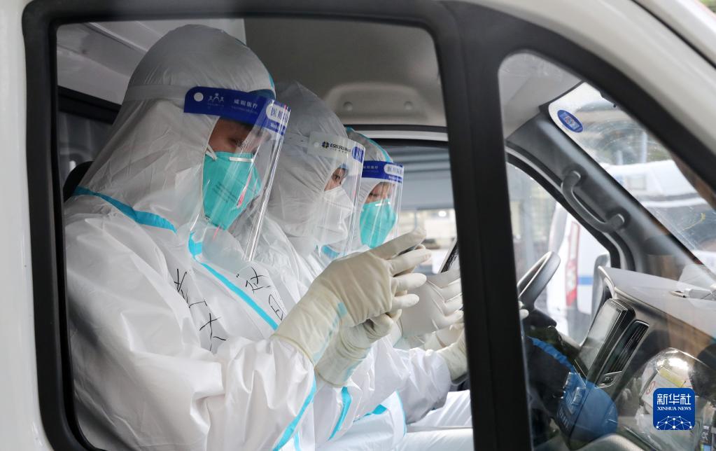 在上海市閔行區七寶鎮一小區內,安徽省援滬醫療隊隊員為居民進(jìn)行核酸檢測采樣(4月4日攝)。新華社記者 方喆 攝