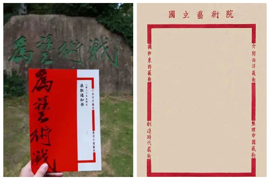 中國美術(shù)學(xué)院寄給學(xué)子們的錄取通知書(shū)封面上是林風(fēng)眠先生所題“為藝術(shù)戰”四字,通知書(shū)的設計靈感源自國立藝專(zhuān)時(shí)期的信紙,上面還寫(xiě)著(zhù)“國美四句教”:介紹西洋藝術(shù)、整理中國藝術(shù)、調和東西藝術(shù)、創(chuàng )作時(shí)代藝術(shù)。
