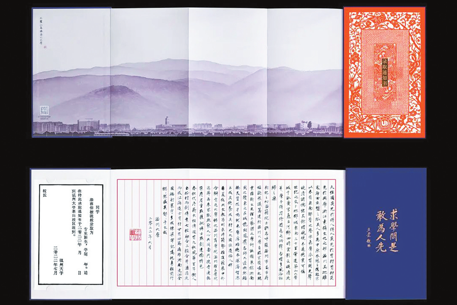 溫州大學(xué)今年的錄取通知書(shū)主打“雙非遺”特色,融入了溫州“細紋刻紙”和“木活字”兩項工藝。其中,錄取通知書(shū)的首頁(yè)是由設計師在細紋刻紙傳承人林邦棟刻畫(huà)的《魚(yú)躍龍門(mén)》上進(jìn)行的二次創(chuàng )作,并融入了現代科技3D激光技術(shù),用視覺(jué)設計體現透空感和3D懸浮動(dòng)感。明年溫州大學(xué)將迎來(lái)90周年慶,錄取通知書(shū)內頁(yè)由木活字傳承人吳魁兆手工印刷,用小楷細述了溫州大學(xué)90年來(lái)的歷程。