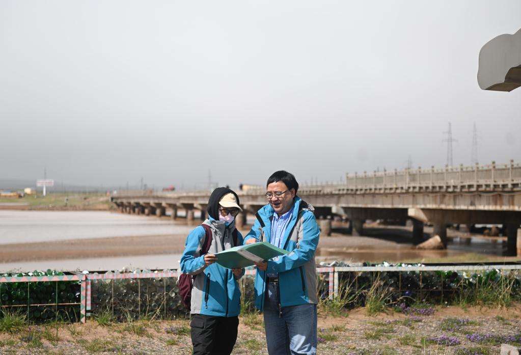 在長(cháng)江源地區,焦弘睿(左)與導師在查看江源地區的資料。新華社記者 張龍攝