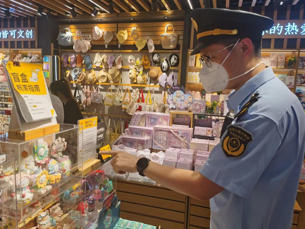 8月2日下午,上海市徐匯區市場(chǎng)監管局組織開(kāi)展盲盒檢查,圖為執法人員檢查盲盒銷(xiāo)售標簽。(受訪(fǎng)對象提供)