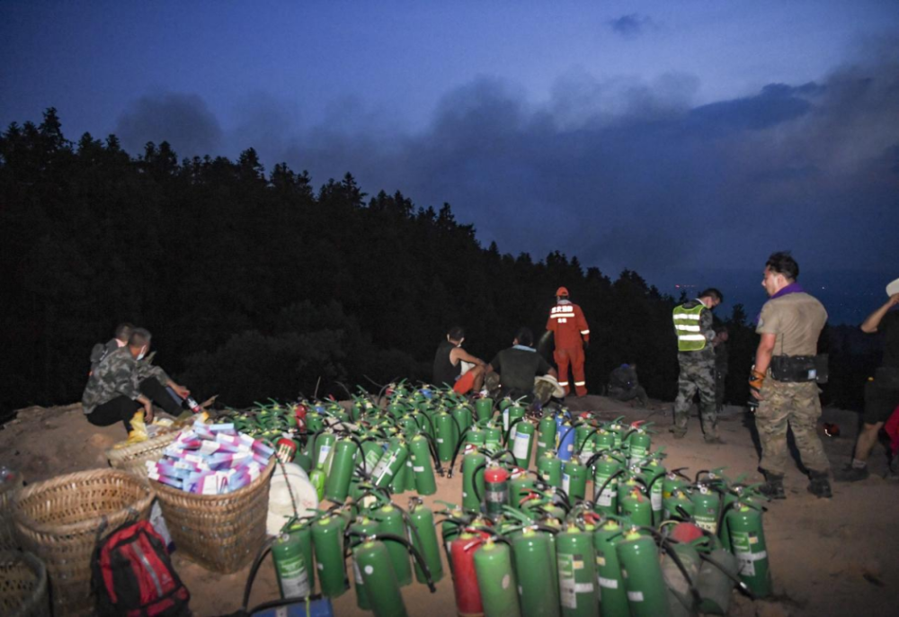 8月25日晚,在山頂隔離帶,救援人員和志愿者嚴陣以待。新華社記者 王全超 攝