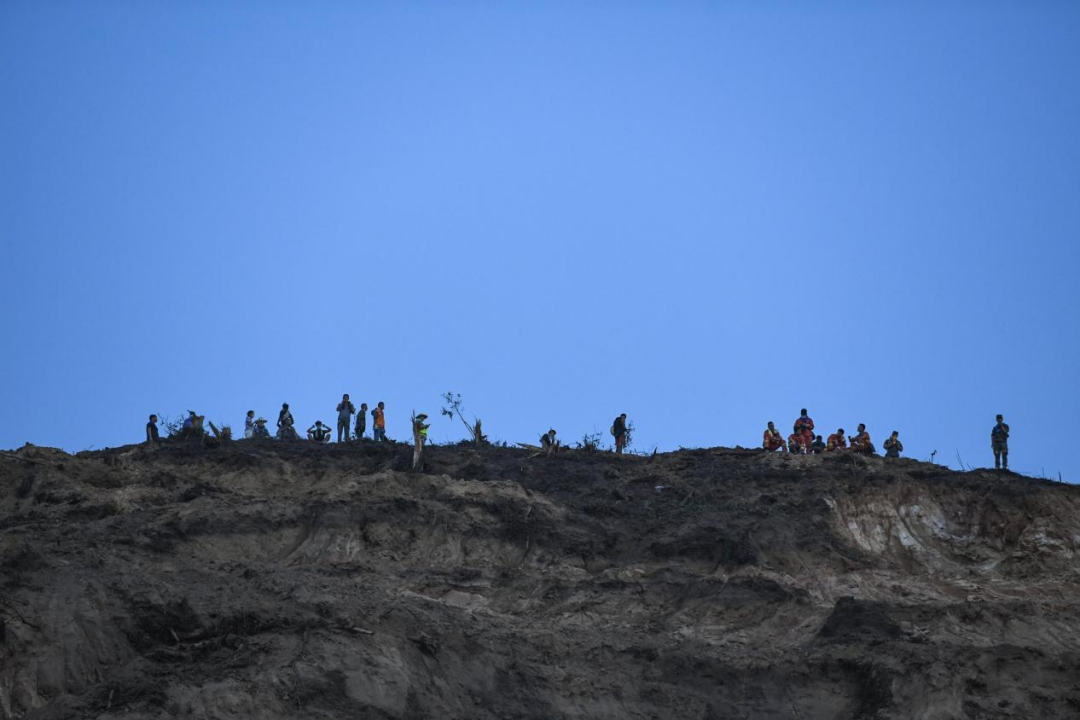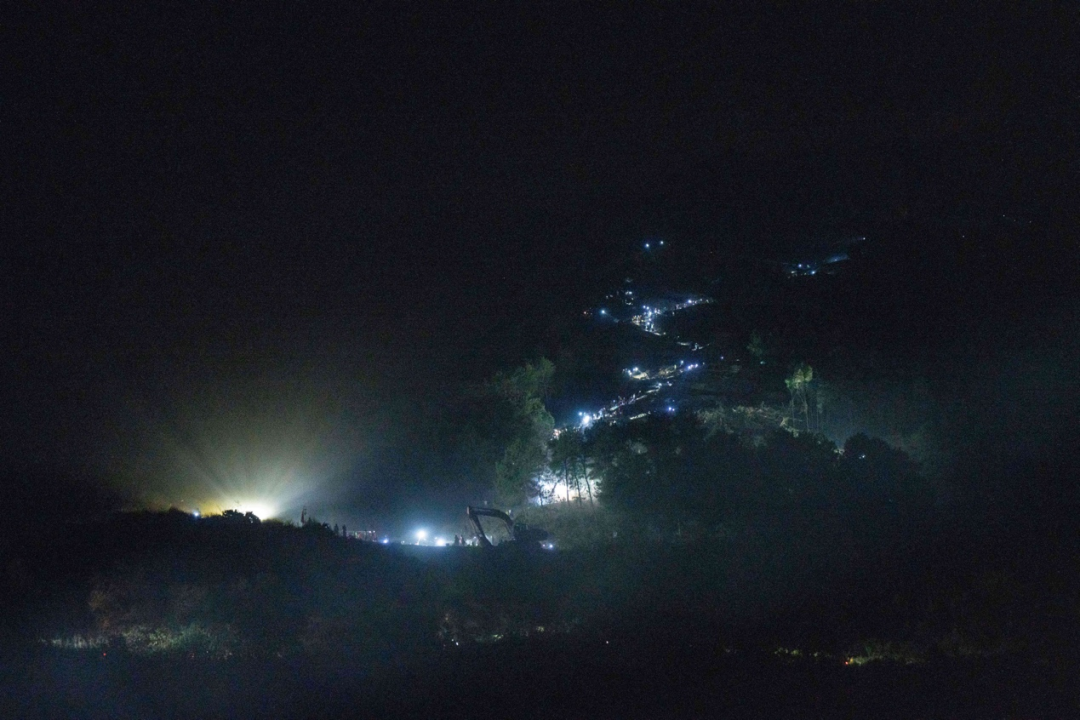 8月25日晚,在山頂隔離帶,救援人員和志愿者嚴陣以待。