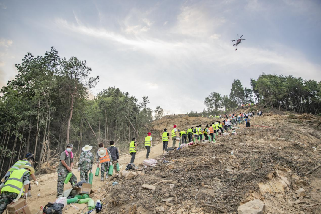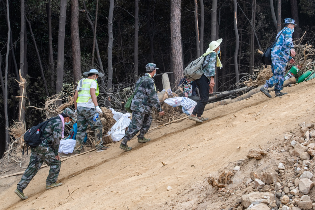 在隔離帶上,救援力量組成了連綿不絕的一堵人墻,運送物資、阻隔火焰……那陡峭的山勢和松軟的沙土,人們不停地摔倒,又不斷地站起……