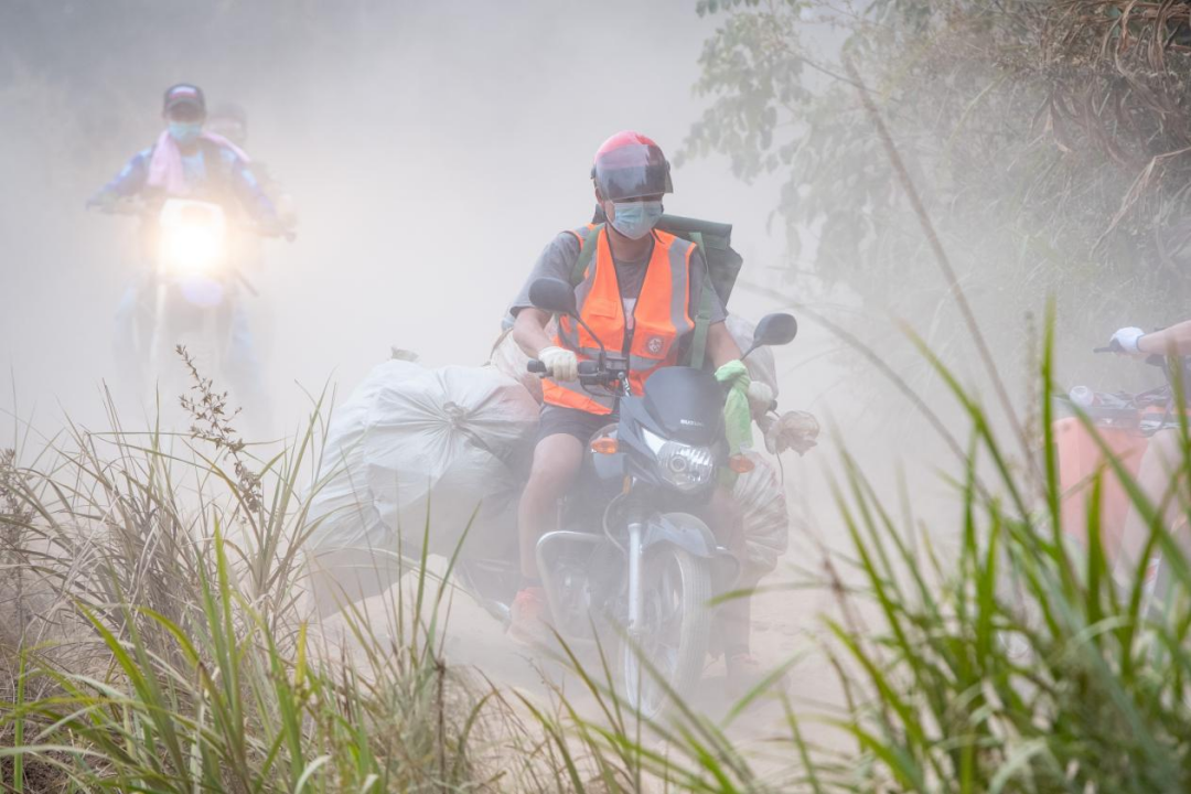 車(chē)行至縉云山腳,由于道路狹窄,汽車(chē)已不能通行,只能步行或是搭乘摩托車(chē)前往。因為是新開(kāi)挖的道路,加上天氣干燥,運送物資的摩托車(chē)來(lái)回奔跑,將近2公里的道路幾乎全時(shí)段都是處于漫天塵土飛揚的狀態(tài)。摩托轟鳴,救援人員腳步匆忙,抬頭望去,山上是密密麻麻排成一溜的志愿者組成的“人鏈”,一場(chǎng)“大戰”來(lái)臨前的緊迫感壓上心頭。
