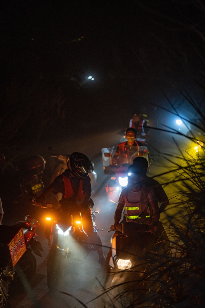 8月26日凌晨,“摩托大軍”志愿者向山頂運送人員與物資。