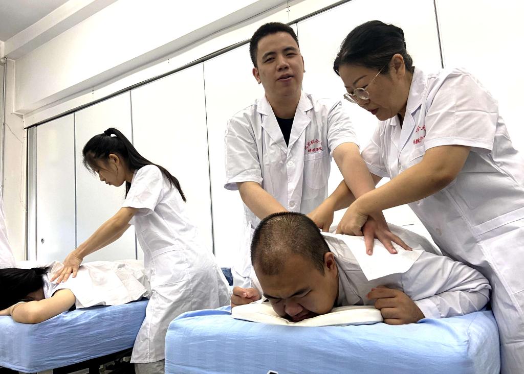圖為張琳(右一)在實(shí)訓室教學(xué)生推拿手法。新華社記者魏夢(mèng)佳攝