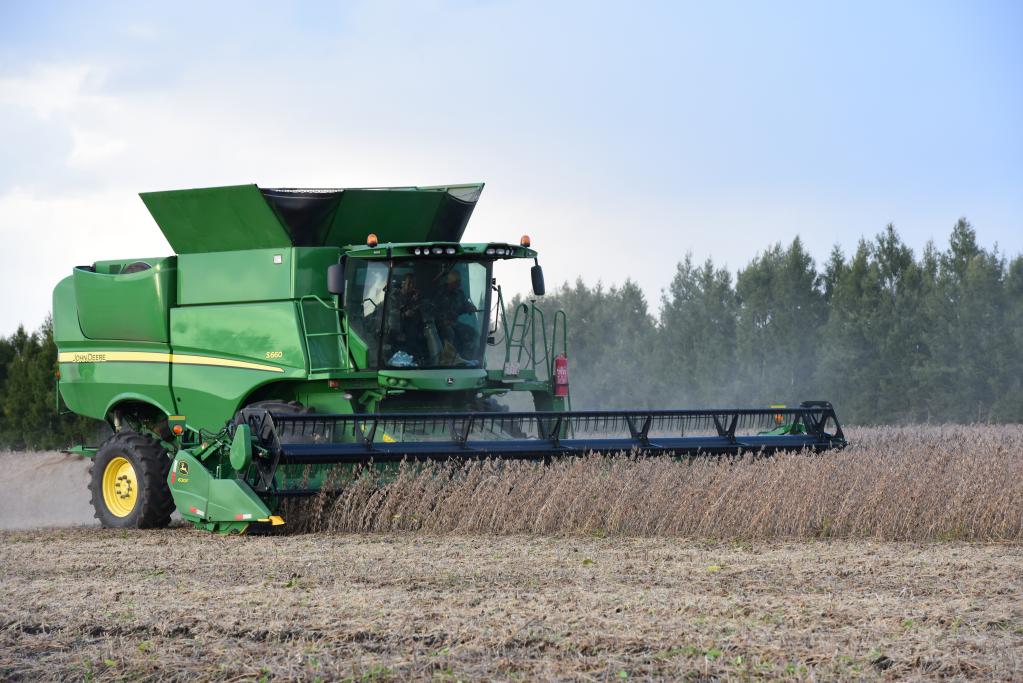 14時(shí)30分,農技技術(shù)員劉恩坪用對講機下達了作業(yè)指令,5臺大型聯(lián)合收割機同時(shí)向前推進(jìn)。農機的轟鳴聲瞬間蓋過(guò)了秋風(fēng)的呼嘯,成片的大豆被卷進(jìn)割臺,秸稈和豆莢被粉碎后直接拋撒在田中。