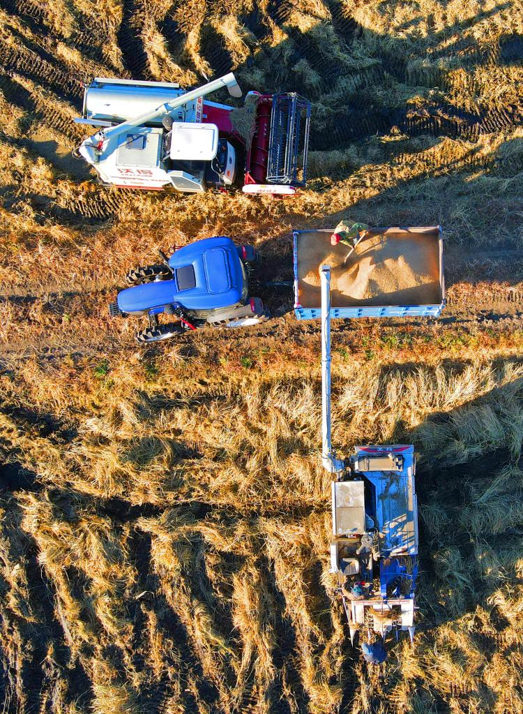 10月18日,在遼寧沈陽(yáng)市沈北新區興隆臺鎮青年農場(chǎng),農民把機械化收割下來(lái)的水稻裝車(chē)(無(wú)人機照片)。 新華社記者 楊青 攝