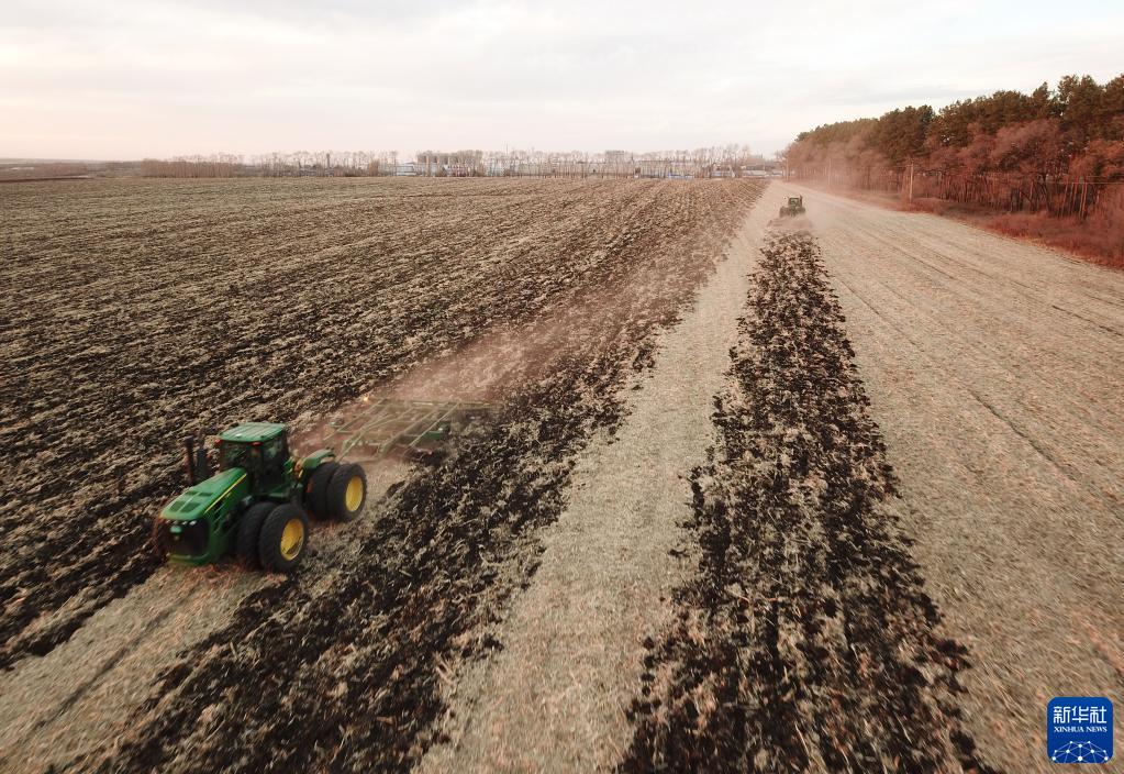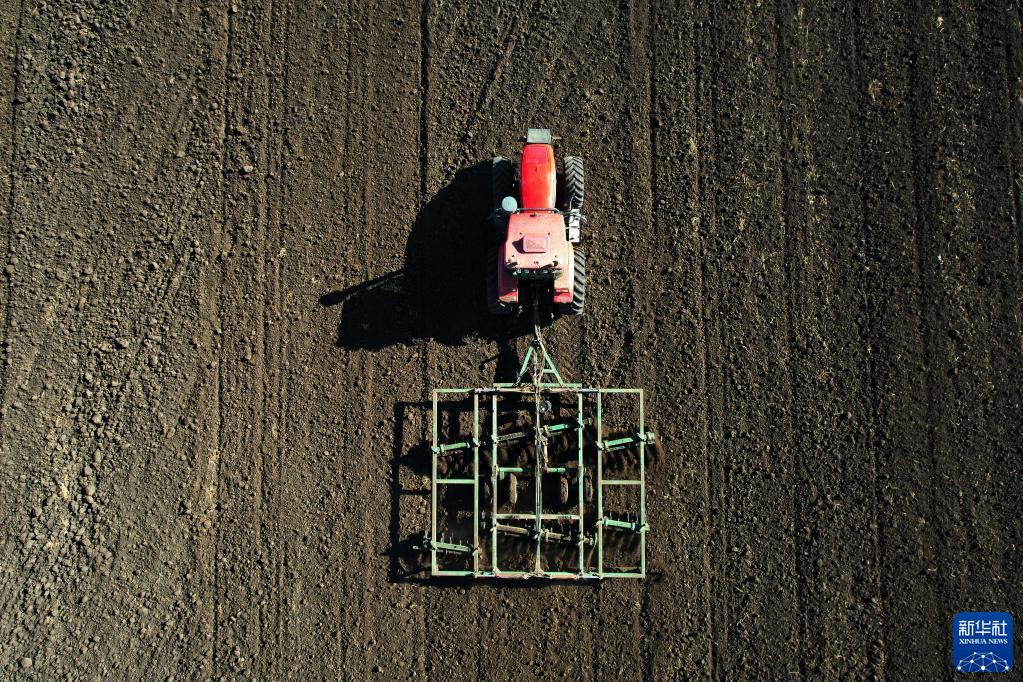 10月19日,在北大荒集團北安分公司趙光農場(chǎng)有限公司一處耕地,農機在進(jìn)行整地作業(yè)(無(wú)人機照片)。新華社記者 王建威 攝