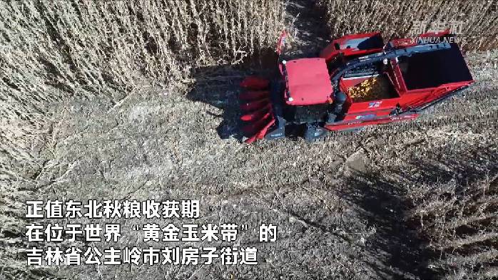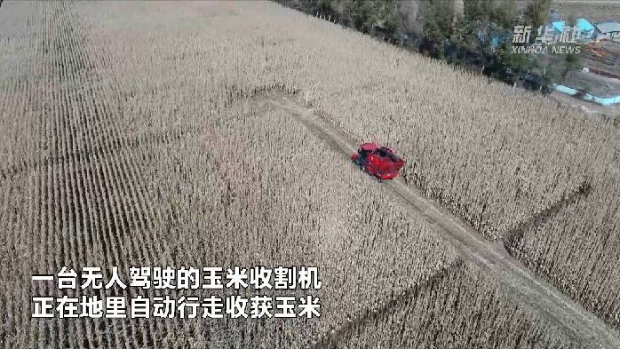 正值東北秋糧收獲期。在位于世界“黃金玉米帶”的吉林省公主嶺市劉房子街道,一臺無(wú)人駕駛的玉米收割機正在地里自動(dòng)行走收獲玉米。