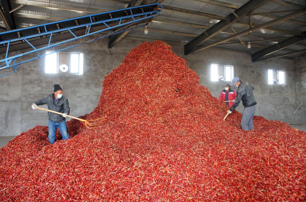 工人在白腦包鎮辣椒產(chǎn)業(yè)示范園初選辣椒。(新華社記者李云平 攝)