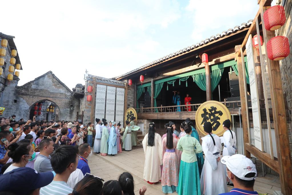 長(cháng)街深巷依舊在,身著(zhù)古代服飾的演員們舞姿婀娜,大型沉浸式實(shí)景演出《流芳》每天都在上演。演出結合跑酷、懸浮裝置、水霧造景等,不僅還原村史館、地方志等記載的真實(shí)歷史故事,還將霉魚(yú)、霉豆腐等傳統小吃的叫賣(mài)場(chǎng)景融入其中。