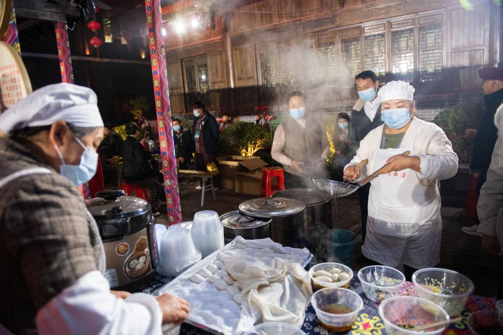 11月18日,在張家界大庸古城,工作人員在制作非遺美食。新華社記者 陳思汗 攝