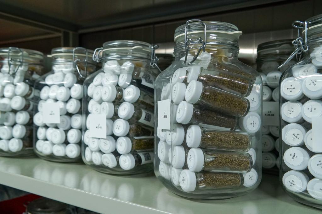 打開(kāi)厚重的鐵門(mén),走進(jìn)資源庫的干燥間,一個(gè)個(gè)中藥種子密封儲存瓶整整齊齊擺放著(zhù),標簽上注明了種子的名稱(chēng)、藥效等。分裝好的中藥種子正在恒溫恒濕的環(huán)境里慢慢脫水。