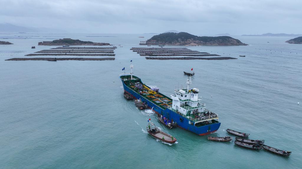 新華社福州11月27日電(記者龐夢(mèng)霞 周義)近日,福建省連江縣苔菉鎮后灣海域熱鬧繁忙,漁民們正忙著(zhù)將5萬(wàn)多籠鮑魚(yú)從運輸船上卸下,再用小船運到漁排上,掛繩下海繼續養殖。