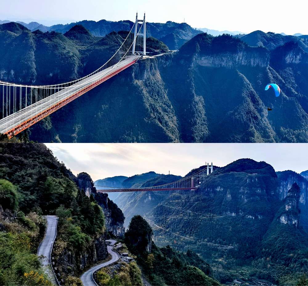 ↑拼版照片上圖:2021年12月4日在“幸福村”一端拍攝的矮寨大橋;下:2021年12月4日在“家庭村”一端拍攝的矮寨大橋。