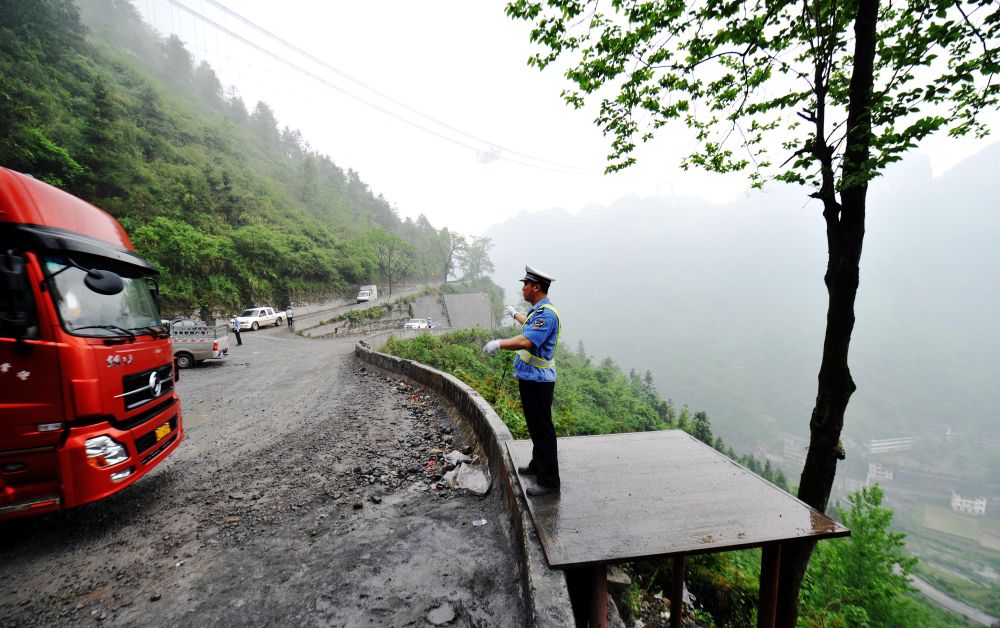 ↑ 2011年5月,交警在矮寨盤(pán)山公路用木板臨時(shí)搭建的指揮臺上疏導交通。