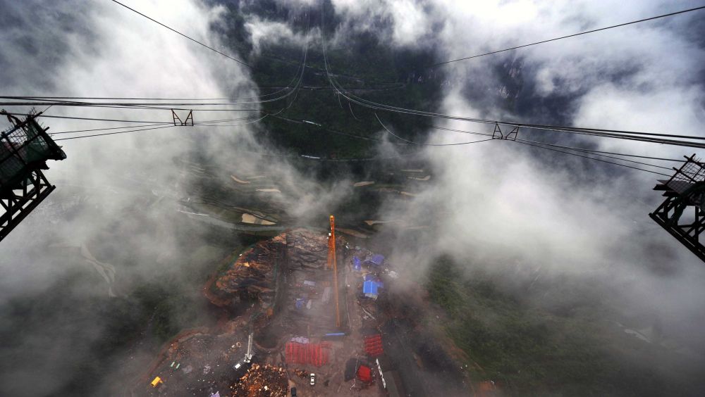 2011年初秋,大橋剛剛完成懸索安裝時(shí),我登上施工“貓道”。雖明知安全無(wú)虞,但站上去的那一刻,山風(fēng)勁猛,深溝險壑間云霧翻滾,我還是被嚇到,雙腿不受控制地開(kāi)啟“震動(dòng)”模式。適應了很長(cháng)一段時(shí)間,我才漸漸擺脫恐懼,走向大橋中間,近距離拍攝施工現場(chǎng)。