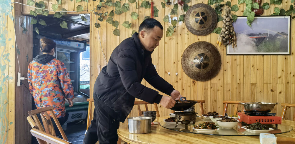 ↑ 2022年3月28日,幸福村的黃勇在“農家樂(lè )”招待客人。