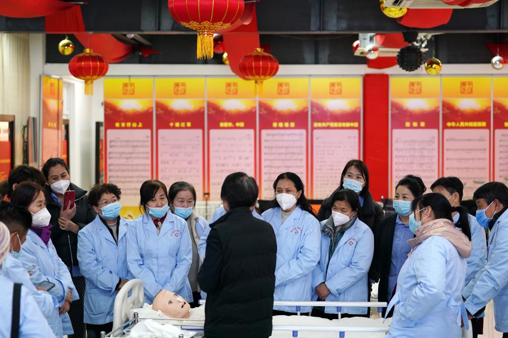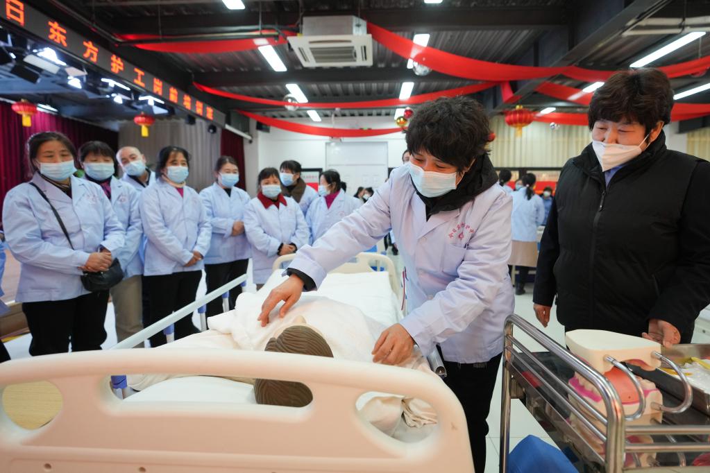 2月4日,在北京市房山區今日東方培訓基地,今年50歲的護工武翠英(前右二)在培訓課程上演示對于臥床病人的看護照料。新華社記者 鞠煥宗 攝
