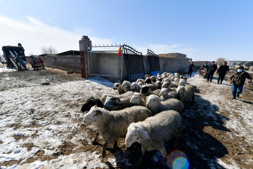 這是2月15日在甘肅省武威市古浪縣黃花灘鎮黃花灘村,村民將出售的肉羊趕出養殖圈舍。新華社記者 范培珅 攝