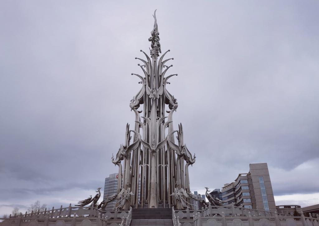 行走在克拉瑪依,“油”的標識隨處可見(jiàn)。在市政府南廣場(chǎng),一座高58米、名為“克拉瑪依之歌”的城市雕塑引人注目。三層鳳凰環(huán)繞貫穿上下的立柱展翅欲飛,象征著(zhù)老中青三代石油人艱苦奮斗的崢嶸歲月。