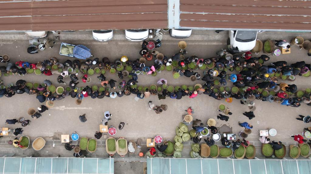 雅安市名山區雙河鮮葉交易市場(chǎng)內,茶農與茶企在進(jìn)行鮮葉交易(無(wú)人機照片)。新華社記者 胥冰潔 攝