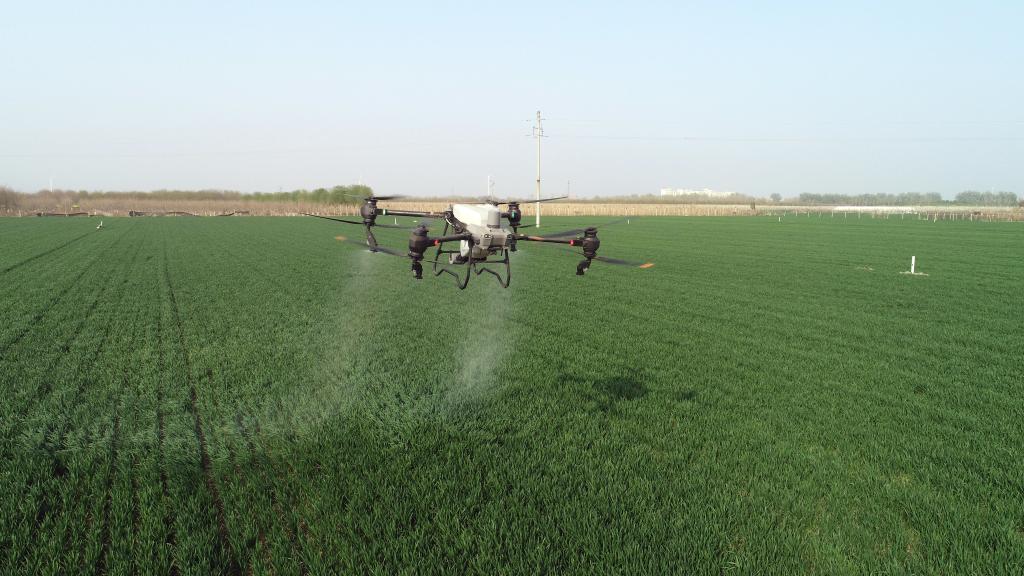 河北省館陶縣樊堡村種糧戶(hù)在用無(wú)人機給小麥噴灑藥物。新華社記者 趙鴻宇 攝