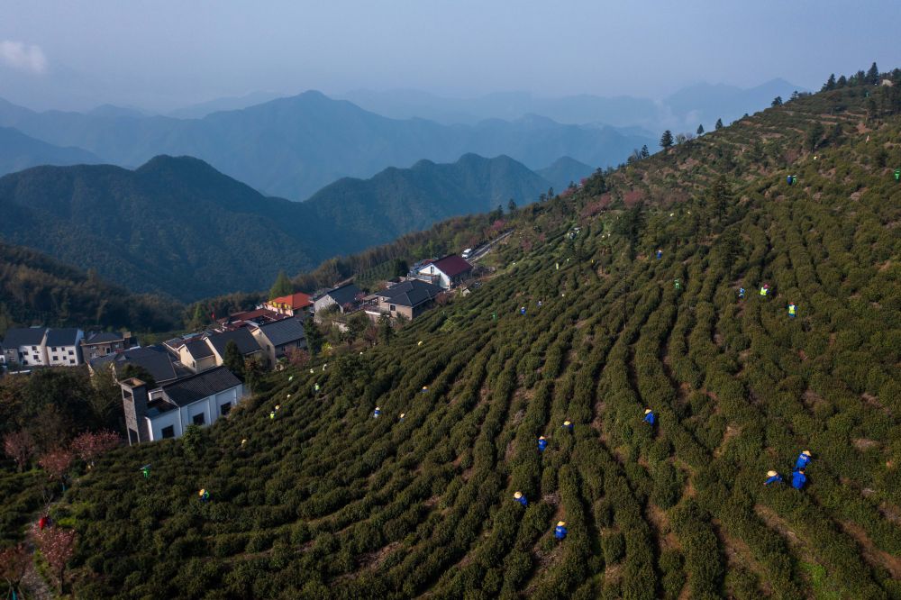 2023年4月7日,浙江省杭州市富陽(yáng)區里山鎮安頂村的茶農在采摘安頂云霧茶(無(wú)人機照片)。新華社記者 徐昱 攝