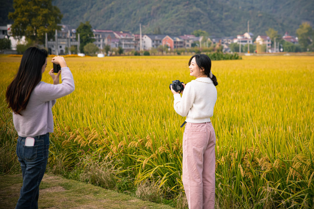 2022年10月25日,游客在浙江省桐廬縣桐君街道梅蓉村的稻田內觀(guān)光。新華社記者 江漢 攝