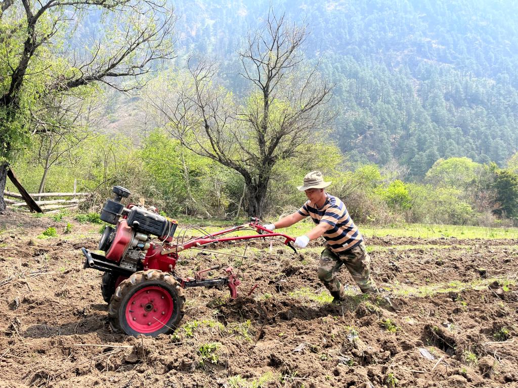 44歲的村民夏多這幾天一刻不得閑,每天一大早,便戴好草帽,穿上膠鞋直奔地里。前些日子剛把水稻田松土澆水完后,緊接著(zhù)他又一頭扎進(jìn)玉米地,推著(zhù)犁地機將田地犁出一道道深深的壟溝?!敖衲晡疫€要幫其他人耕地,13畝多的地得抓緊收拾好,過(guò)幾天就要種玉米了?!?/p>