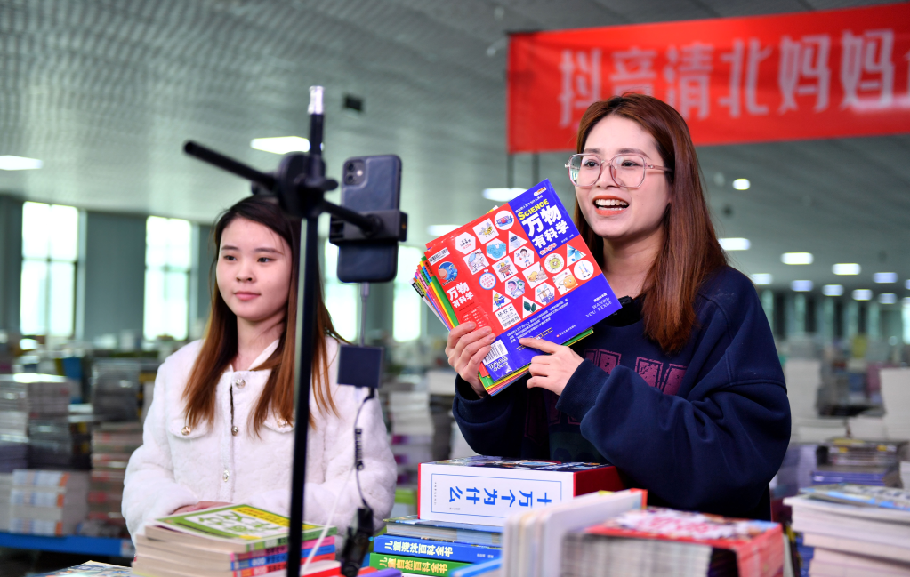 在河北永清經(jīng)濟開(kāi)發(fā)區京聯(lián)集團館配圖書(shū)聯(lián)合現采基地,工作人員在電商平臺直播銷(xiāo)售圖書(shū)。新華社記者 駱學(xué)峰 攝