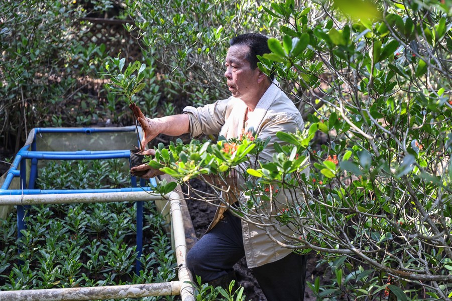 新華社???月8日電(記者王軍鋒 郭良川)“這株紅欖李苗是第三代,你看,花開(kāi)得多艷!”在海南東寨港國家級自然保護區的一片苗圃,67歲的王式軍站在泥濘的灘涂里說(shuō)。