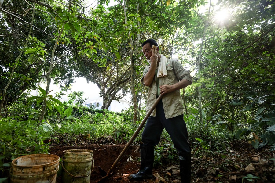 6月2日,在海南東寨港國家級自然保護區的苗圃?xún)?,王式軍在工作間隙擦拭汗水。新華社記者 張麗蕓 攝