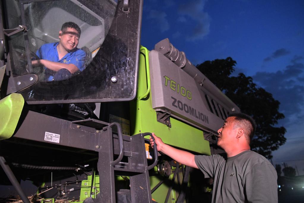 6月7日晚,村支部書(shū)記吳東星(右)和農機手溝通收割注意事項。新華社記者張浩然 攝