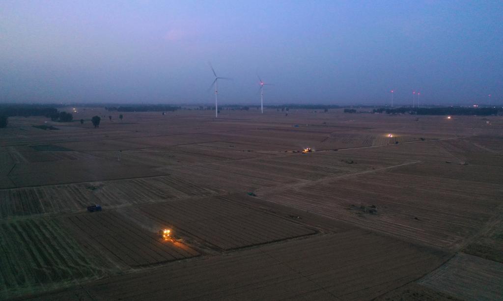 6月7日晚,收割機在袁營(yíng)村搶收(無(wú)人機照片)。新華社記者張浩然 攝