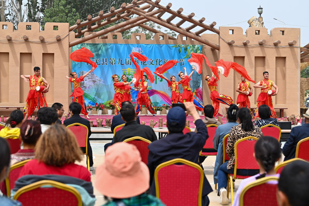 在新疆若羌縣瓦石峽鎮,若羌縣樓蘭藝術(shù)團的演員為參加棗花節的游客表演歌舞(5月28日攝)。新華社記者 丁磊 攝