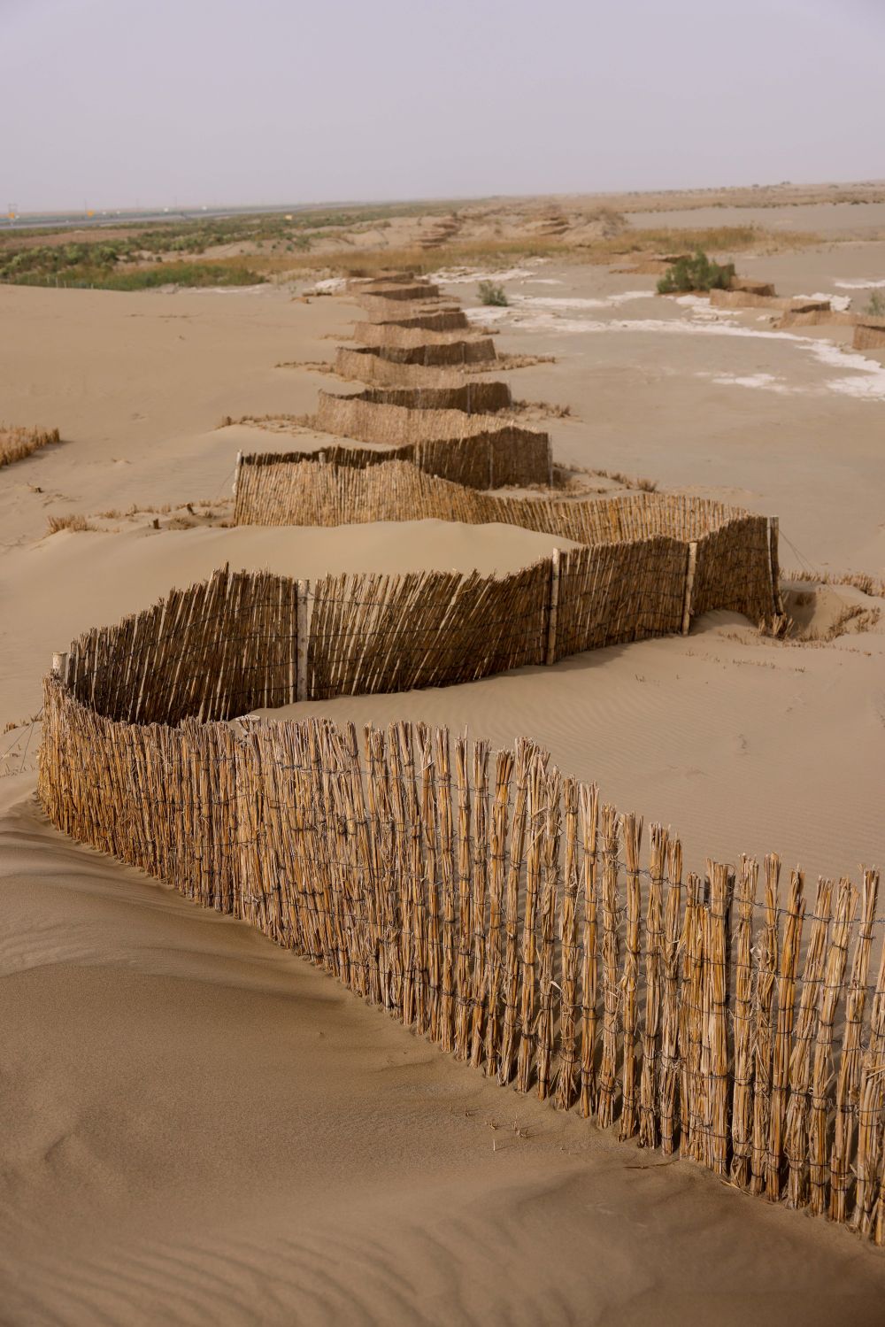 這是在和若鐵路沿線(xiàn)拍攝的1.5米高的立式沙障(2022年5月18日攝)。新華社記者 丁磊 攝