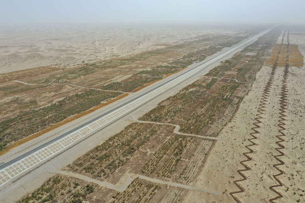 記者從中鐵第一勘察設計院集團有限公司了解到,在被流動(dòng)沙丘侵害嚴重的和若鐵路沿線(xiàn),建設者修建草方格近5000萬(wàn)平方米,種植梭梭、紅柳、沙棘等灌木和喬木近1296萬(wàn)株,林帶覆蓋面積超過(guò)11萬(wàn)畝,這條“綠色走廊”成為防風(fēng)固沙的天然屏障。
