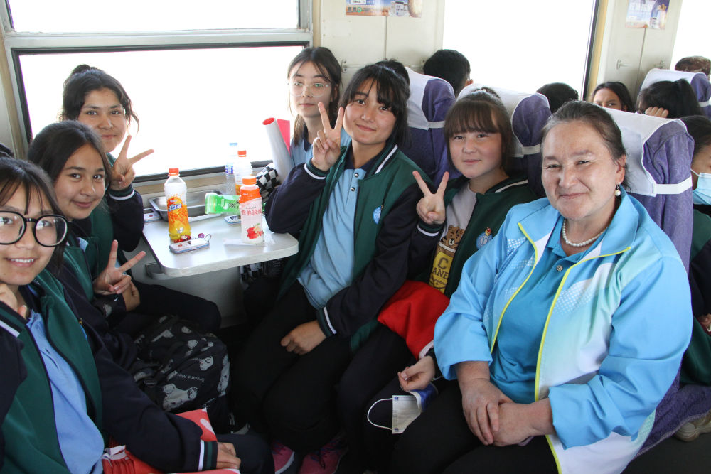 這是乘坐和若鐵路列車(chē)去庫爾班大叔家鄉研學(xué)的學(xué)生們和老師(5月29日攝)。新華社記者 劉紅霞 攝