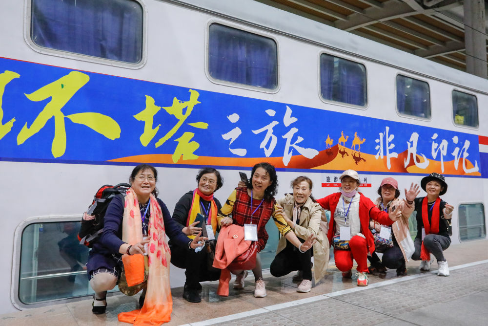 在新疆烏魯木齊站,游客在“環(huán)塔之旅·非凡印記”旅游專(zhuān)列前合影(3月27日攝)。新華社發(fā)(陳繼偉 攝)