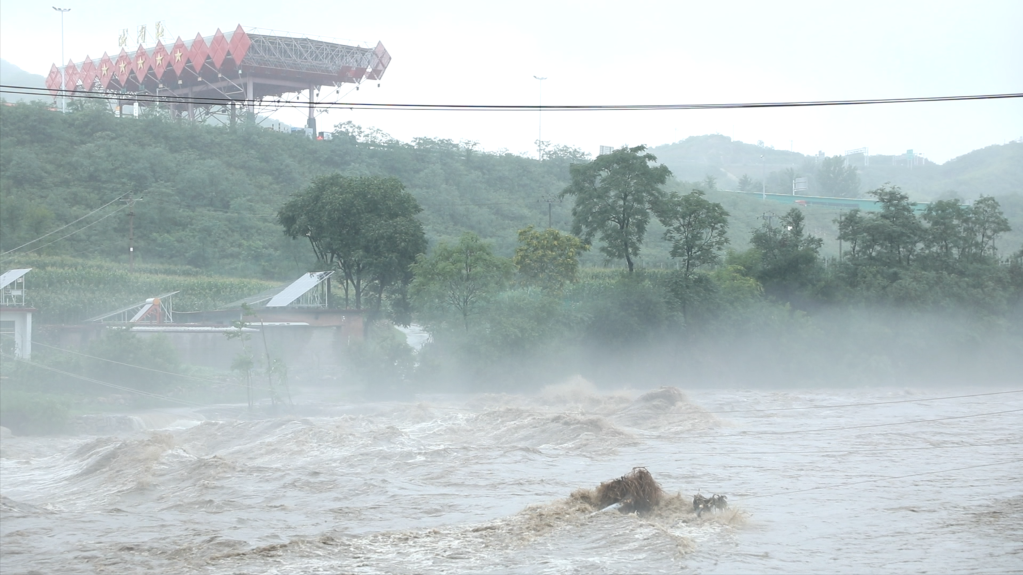 河北省阜平縣城南莊鎮大岸底村位于太行山區,受極端暴雨天氣影響,流經(jīng)城南莊鎮的胭脂河水位持續上漲,河中漂浮著(zhù)被沖毀的樹(shù)木,部分玉米倒伏在水中,河水不斷沖擊著(zhù)岸邊。