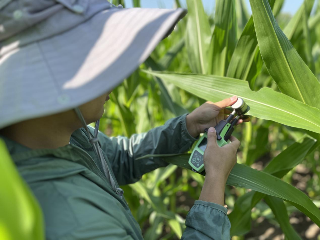 科研人員在田間測植株葉綠素含量。(受訪(fǎng)者供圖)