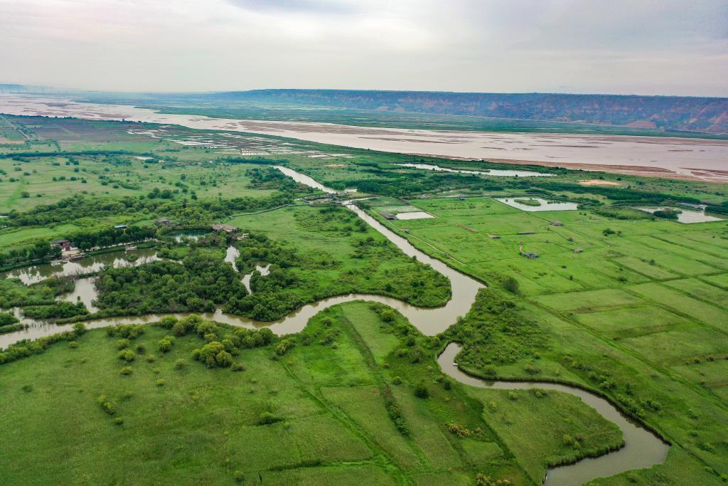2023年6月2日,無(wú)人機拍攝的陜西省渭南市合陽(yáng)縣境內的黃河濕地。新華社發(fā)(趙嘵罡 攝)