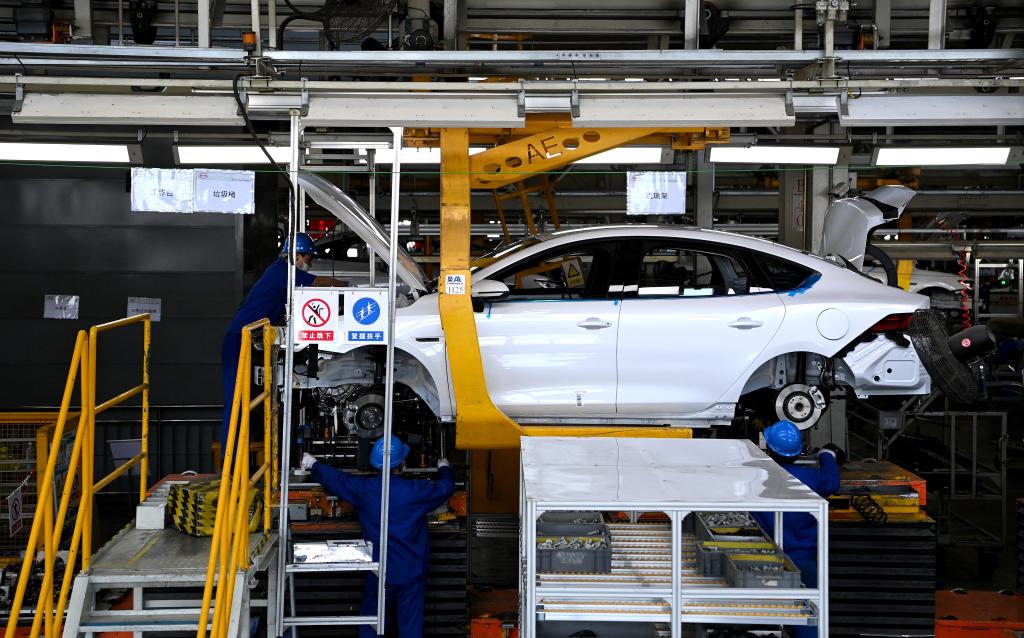 2022年4月20日,工作人員在西安比亞迪草堂工業(yè)園汽車(chē)總裝廠(chǎng)進(jìn)行新能源汽車(chē)裝配。新華社記者 劉瀟 攝